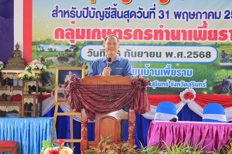 วันที่ 26 กันยายน 2568 เวลา 09.30 น. นายทวีภัทร เหล่าบรรเทา สหกรณ์จังหวัดสุรินทร์ ประธานในพิธีเปิดการประชุมใหญ่สามัญประจำปี 2567 ของกลุ่มเกษตรกรทำนาเพี้ยราม พร้อมด้วยนางสาวพยอม พาพาน ผู้อำนวยการกลุ่มส่งเสริมสหกรณ์ 1 และคณะ โดยมีสมาชิกเข้าประชุม 491 คน จากสมาชิกทั้งหมด 749 คน ประธานในพิธีได้กล่าวให้โอวาทเพื่อเป็นขวัญกำลังใจให้กับสมาชิก กลุ่มเกษตรกร และมอบทุนสาธารณประโยชน์ ให้กับศูนย์พัฒนาเด็กเล็กและโรงเรียน ในพื้นที่ จำนวน 5 ทุน สำหรับปีบัญชีสิ้นสุดวันที่ 30 พฤษภาคม 2568 กลุุ่มเกษตรกรมีทุนดำเนินงานทั้งสิ้น 5,273,528.90 บาท กำไรสุทธิประจำปี 417,323.09 บาท แนะนำการเพิ่มปริมาณธุรกิจ การระดมทุนภายในเพิ่มการพิจารณาจัดสรรกำไรสุทธิให้เป็นไปตามกฎหมายและข้อบังคับ ส่งเสริมการมีส่วนร่วมของสมาชิก ละแนะนำบทบาทหน้าที่ของสมาชิก คณะกรรมการดำเนินการ ผู้ตรวจสอบกิจการ ณ โรงเรียนบ้านเพี้ยราม ตำบลเพี้ยราม อำเภอเมืองสุรินทร์ จังหวัดสุรินทร์